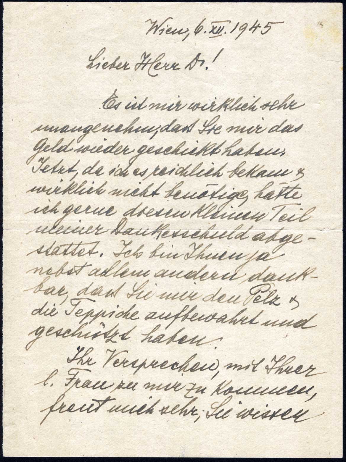 Jetzt, da ich es reichlich bekam & wirklich nicht benötige, hätte ich gerne diesen kleinen Teil meiner Dankesschuld abgestattet. Ich bin Ihnen ja nebst allem anderen dankbar, daß Sie mir den Pelz & die Teppiche aufbewahrt und geschützt haben.