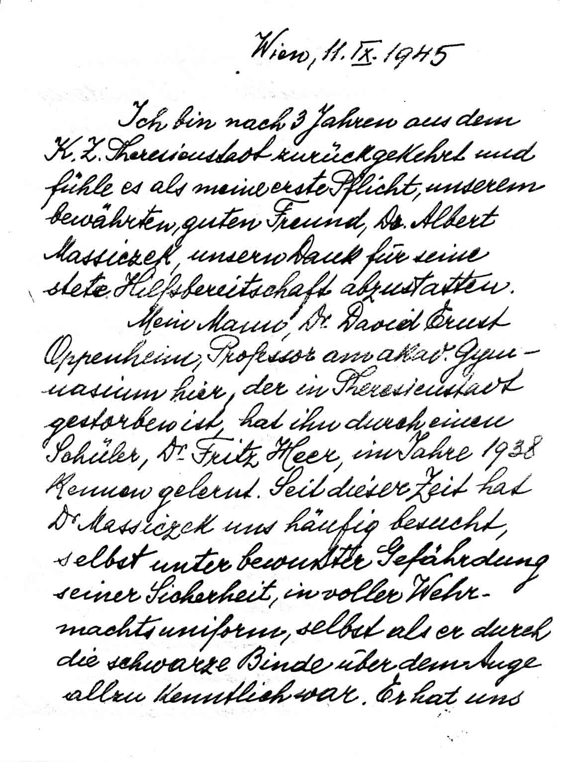 Mein Mann, Dr. David Ernst Oppenheim, Professor am akad. Gymnasium hier, der in Theresienstadt gestorben ist, hat ihn durch einen Schüler, Dr. Fritz Heer, im Jahre 1938 kennen gelernt. Seit dieser Zeit hat Dr. Massiczek uns häufig besucht, selbst unter bewußter Gefährdung seiner Sicherheit, in voller Wehrmachtsuniform, selbst als er durch die schwarze Binde über dem Auge allzu kenntlich war. Er hat uns jedesmal zahlreiche nötige, uns fehlende Lebensmittel und anderes gebracht, einen großen Teil der wertvollen Bibliothek meines Mannes zu sich genommen und so gerettet. Nach Theresienstadt hat er uns wiederholt Liebesgabenpakete geschickt, die für uns von wesentlicher Bedeutung waren. Neben dieser materiellen Unterstützung war auch die moralische Hilfe ungemein wertvoll.