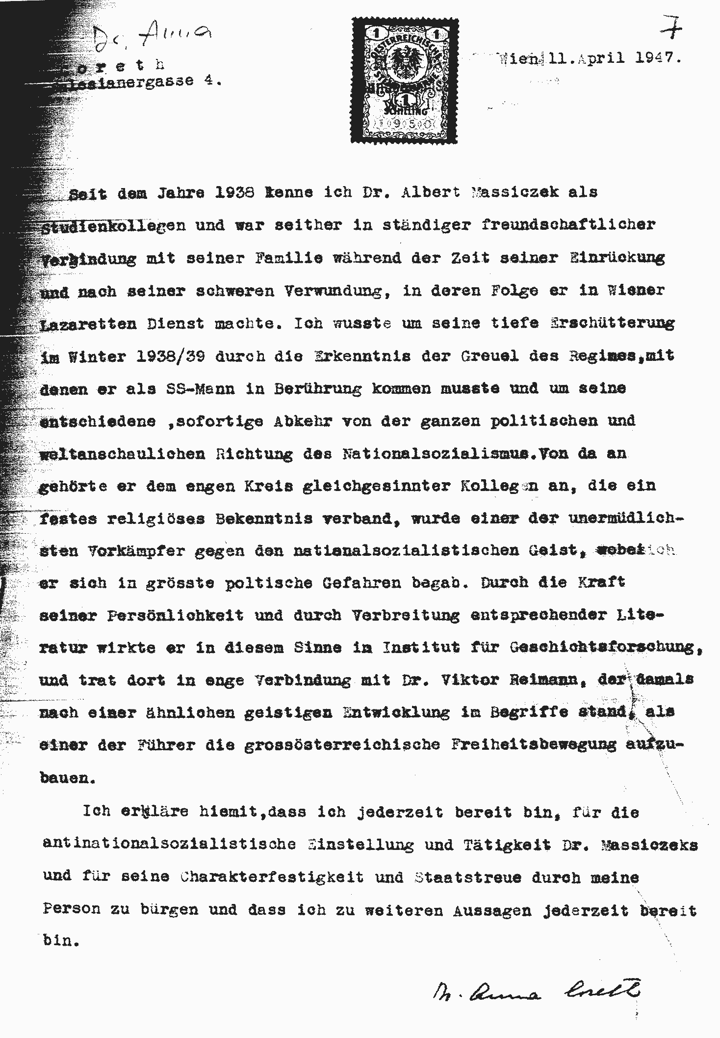 Ich erkläre hiemit, dass ich jederzeit bereit bin, für die antinationalsozialistische Einstellung und Tätigkeit Dr. Massiczeks und für seine Charakterfestigkeit und Staatstreue durch meine Person zu bürgen und dass ich zu weiteren Aussagen jederzeit bereit bin.