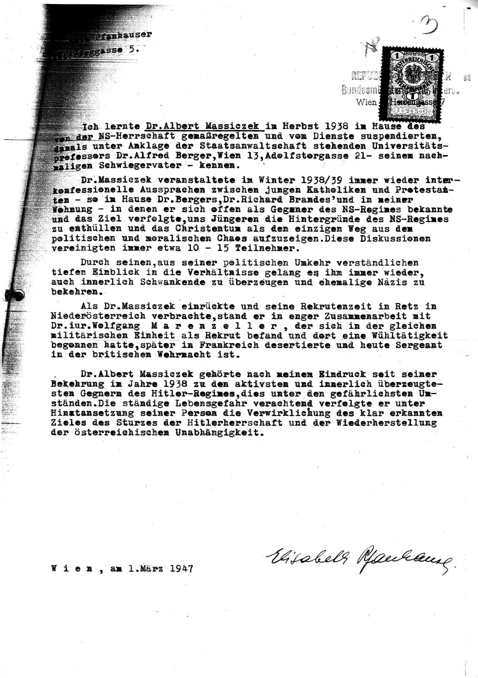 Dr. Albert Massiczek gehörte nach meinem Eindruck seit seiner Bekehrung im Jahre 1938 zu den aktivsten und innerlich überzeugtesten Gegnern des Hitler-Regimes, dies unter den gefährlichsten Umständen. Die ständige Lebensgefahr verachtend verfolgte er unter Hintansetzung seiner Person die Verwirklichung des klar erkannten Zieles des Sturzes der Hitlerherrschaft und der Wiederherstellung der österreichischen Unabhängigkeit.
