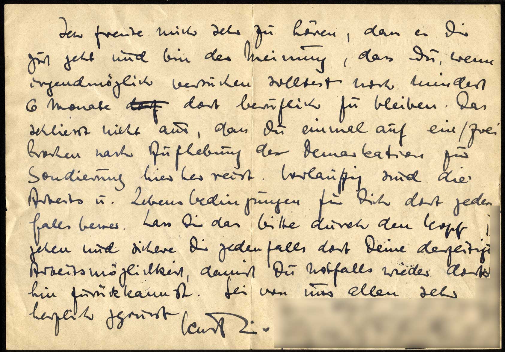 Ich freue mich sehr zu hören, dass es Dir gut geht und ich bin der Meinung, dass Du, wenn irgendmöglich versuchen solltest noch zumindest 6 Monate dort beruflich zu bleiben. Das schliesst nicht aus, dass Du einmal auf eine/zwei Wochen nach Aufhebung der Demarkation zur Sondierung hierher reist. Vorläufig sind die Arbeits- und Lebensbedingungen für Dich dort jedenfalls besser. Lass Dir das bitte durch den Kopf gehen und sichere Dir jedenfalls dort Deine derzeitige Arbeitsmöglichkeit, damit Du notfalls wieder dorthin zurück kannst.