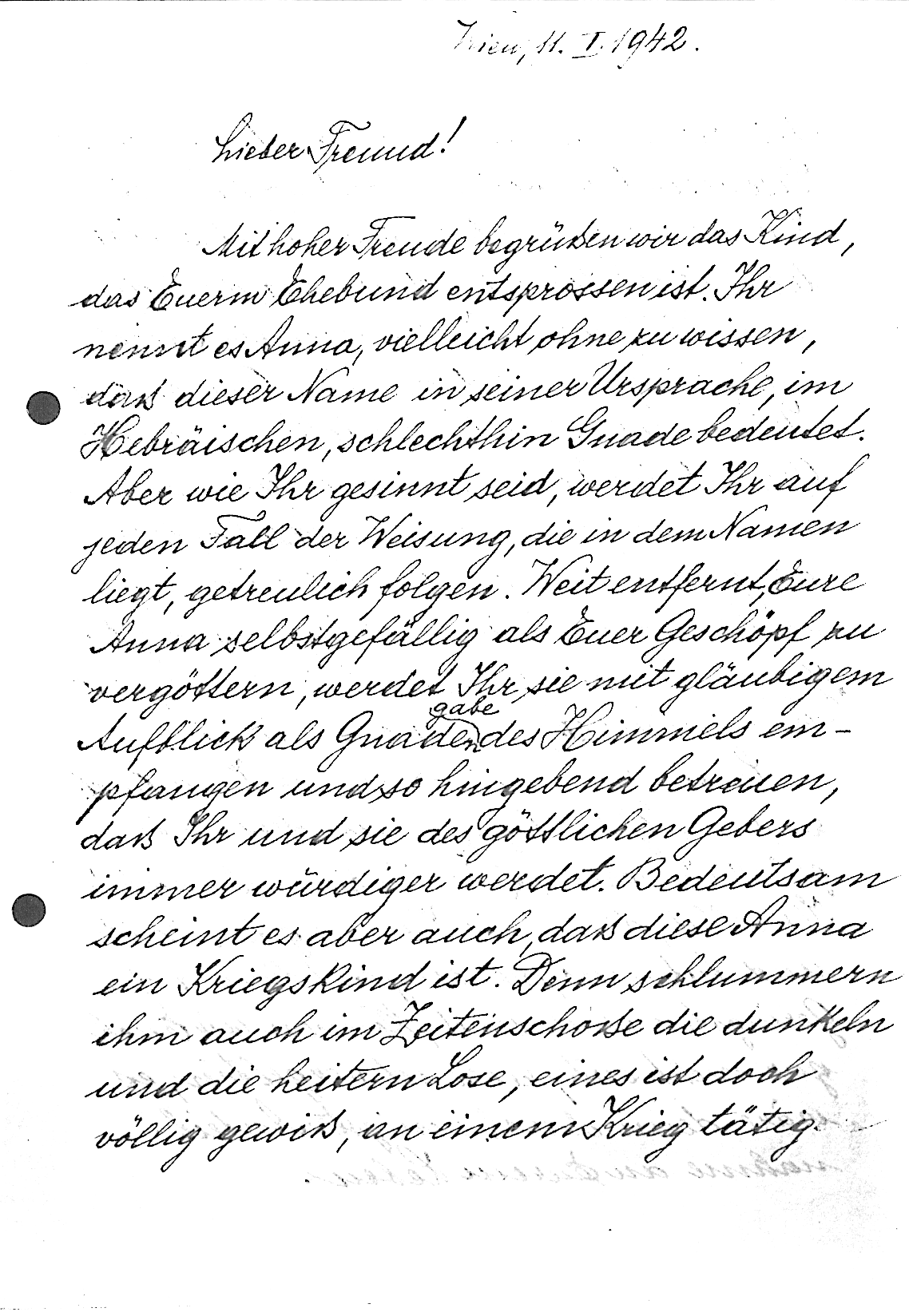 Mit hoher Freude begrüßen wir das Kind, das Euerm Ehebund entsprossen ist. Ihr nennt es Anna, vielleicht ohne zu wissen, daß dieser Name in seiner Ursprache, im Hebräischen, schlechthin Gnade bedeutet. Aber wie Ihr gesinnt seid, werdet Ihr auf jeden Fall der Weisung, die in dem Namen liegt, getreulich folgen. Weit entfernt, Eure Anna selbstgefällig als Euer Geschöpf zu vergöttern, werdet Ihr sie mit gläubigem Aufblick als Gnadengabe des Himmels empfangen und so hingebend betreuen, daß Ihr und sie des göttlichen Gebers immer würdiger werdet. Bedeutsam scheint es aber auch, daß diese Anna ein Kriegskind ist. Denn schlummern ihm auch im Zeitenschoße die dunkeln und die heitern Lose, eines ist doch völlig gewiß, an einem Krieg tätig Teil zu nehmen, ist ihm durch sein Geschlecht verboten. Und so könnt Ihr in der Geburt dieses Kindes ein tröstliches Sinnbild sehen, daß diesem höllischen Krieg doch ein Friede entspringen wird, der eine Gnade des Himmels ist, weil er nicht durch die Gewalt der Waffen erzwungen, sondern aus gutem Willen geschaffen ist, jener Friede, von dem der kaum verklungene Weihnachtsgruß sagt: „Gloria in excelsis deo et in terris pax hominibus bonae voluntatis.“