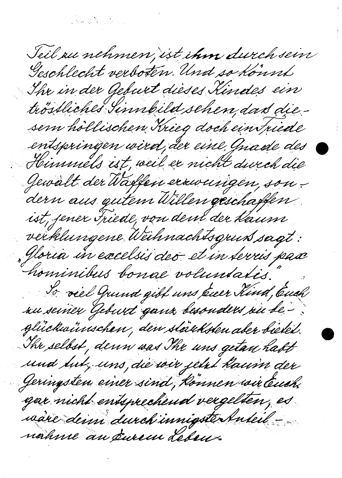 So viel Grund gibt uns Euer Kind, Euch zu seiner Geburt ganz besonders zu beglückwünschen, den stärksten aber bietet Ihr selbst, denn was Ihr uns getan habt und tut, uns, die wir jetzt kaum der Geringsten einer sind, können wir Euch gar nicht entsprechend vergelten, es wäre denn durch innigste Anteilnahme an Eurem Leben.