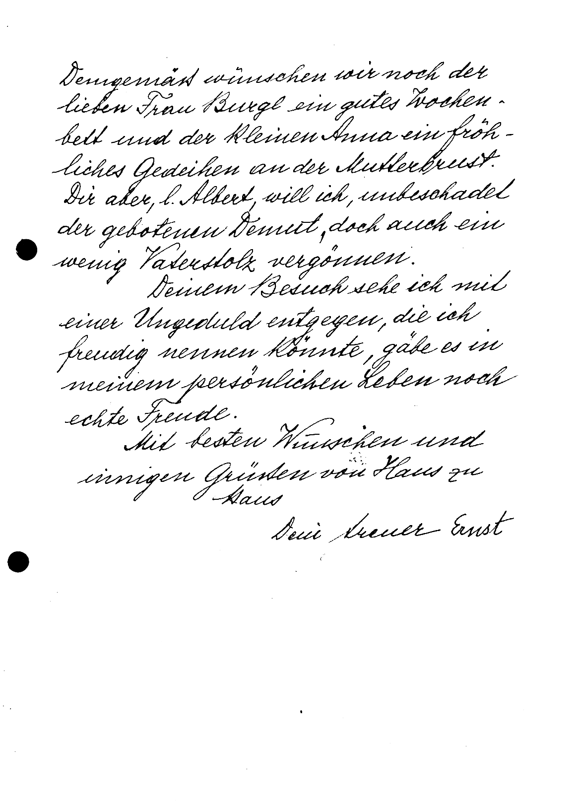 Demgemäß wünschen wir noch der lieben Frau Burgl ein gutes Wochenbett und der kleinen Anna ein fröhliches Gedeihen an der Mutterbrust. Dir aber, l. Albert, will ich unbeschadet der gebotenen Demut, doch auch ein wenig Vaterstolz vergönnen.