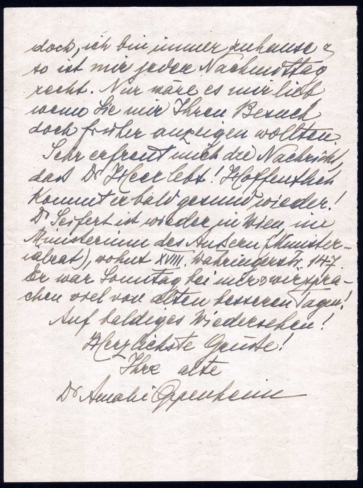 Ihr Versprechen, mit Ihrer l. Frau zu mir zu kommen, freut mich sehr, Sie wissen, doch, ich bin immer zuhause & so ist mir jeder Nachmittag recht. Nur wäre es mir lieb, wenn Sie mir Ihren Besuch doch früher anzeigen wollten.