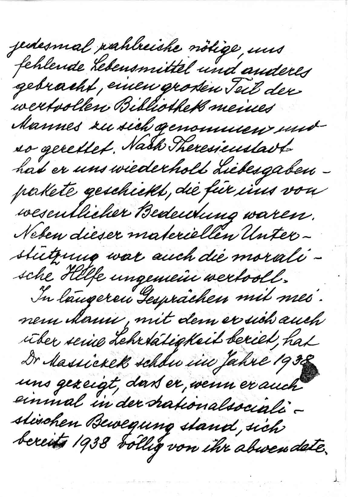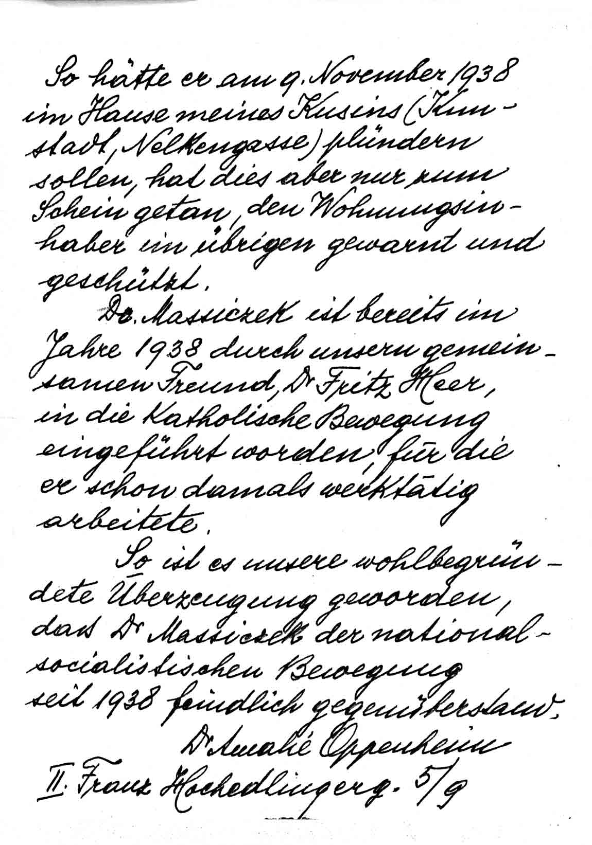 In längeren Gesprächen mit meinem Mann, mit dem er sich auch über seine Lehrtätigkeit beriet, hat Dr. Massiczek schon im Jahr 1938 uns gezeigt, daß er, wenn er auch einmal in der nationalsozialistischen Bewegung stand, sich bereits 1938 völlig von ihr abwendete. So hätte er am 9. November 1938 im Hause meines Kusins (Kimstadt, Nelkengasse) plündern sollen, hat dies aber nur zum Schein getan, den Wohnungsinhaber im übrigen gewarnt und geschützt.