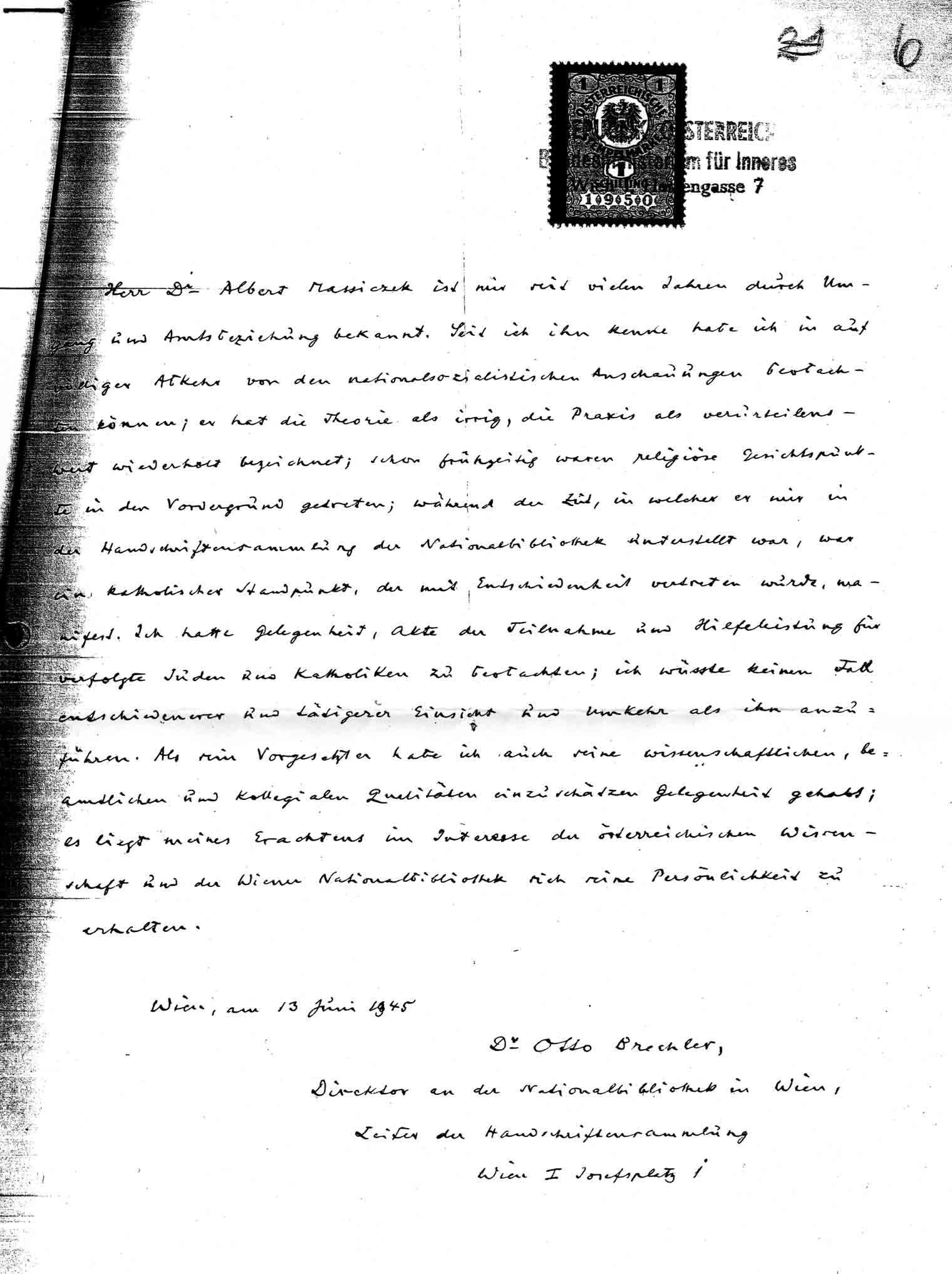 Herr Dr. Albert Massiczek ist mir seit vielen Jahren durch Umgang und Amtsbeziehung bekannt. Seit ich ihn kenne habe ich [ihn] in aufrichtiger Abkehr von den nationalsozialistischen Anschauungen beobachten können; er hat die Theorie als irrig, die Praxis als verurteilenswert wiederholt bezeichnet; schon frühzeitig waren religiöse Ansichtspunkte in den Vordergrund getreten; während der Zeit, in welcher er mir in der Handschriftensammlung der Nationalbibliothek unterstellt war, war ein katholischer Standpunkt, der mit Entschiedenheit vertreten wurde, manifest. Ich hatte Gelegenheit, Akte der Teilnahme und Hilfeleistung für verfolgte Juden und Katholiken zu beobachten; ich wüsste keinen Fall entschiedenerer und tätigerer Einsicht und Umkehr als ihn anzuführen. Als sein Vorgesetzter habe ich auch seine wissenschaftlichen, beamtlichen und kollegialen Qualitäten einzuschätzen Gelegenheit gehabt. Es liegt meines Erachtens im Interesse der österreichischen Wissenschaft und der Wiener Nationalbibliothek sich seine Persönlichkeit zu erhalten.