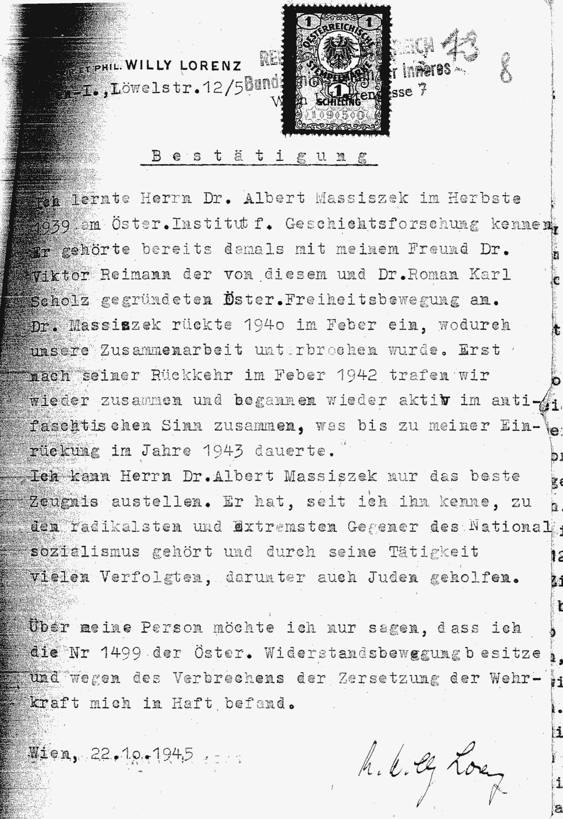 Ich kann Herrn Dr. Albert Massiczek nur das beste Zeugnis austellen [sic]. Er hat, seit ich ihn kenne, zu den radikalsten und extremsten Gegener [sic] des Nationalsozialismus gehört und durch seine Tätigkeit vielen Verfolgten, darunter auch Juden geholfen.