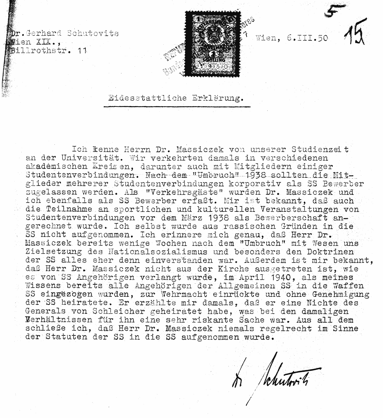 Ich kenne Herrn Dr. Massiczek von unserer Studentenzeit an der Universität. Wir verkehrten damals in verschiedenen akademischen Kreisen, darunter auch mit Mitgliedern einiger Studentenverbindungen. Nach dem „Umbruch“ 1938 sollten die Mitglieder mehrerer Studentenverbindungen korporativ als SS Bewerber zugelassen werden. Als „Verkehrsgäste“ wurden Dr. Massiczek und ich ebenfalls als SS Bewerber erfasst. Mir ist bekannt, daß auch die Teilnahme an sportlichen und kulturellen Veranstaltungen von Studentenverbindungen vor dem März 1938 als Bewerberschaft angerechnet wurde. Ich selbst wurde aus rassischen Gründen in die SS nicht aufgenommen. Ich erinnere mich genau, dass Herr Dr. Massiczek bereits wenige Wochen nach dem „Umbruch“ mit Wesen und Zielsetzung des Nationalsozialismus und besonders den Doktrinen der SS alles eher denn einverstanden war. Außerdem ist mir bekannt, daß Dr. Massiczek nicht aus der Kirche ausgetreten ist, wie es von SS Angehörigen verlangt wurde, im April 1940, als meines Wissens alle Angehörigen der Allgemeinen SS in die Waffen-SS eingezogen wurden, zur Wehrmacht einrückte und ohne Genehmigung der SS heiratete. Er erzählte mir damals, daß er eine Nichte des Generals von Schleicher geheiratet habe, was bei den damaligen Verhältnissen für ihn eine sehr riskante Sache war. Aus all dem schließe ich, daß Dr. Massiczek niemals regelrecht im Sinne der Statuten der SS in die SS aufgenommen wurde.