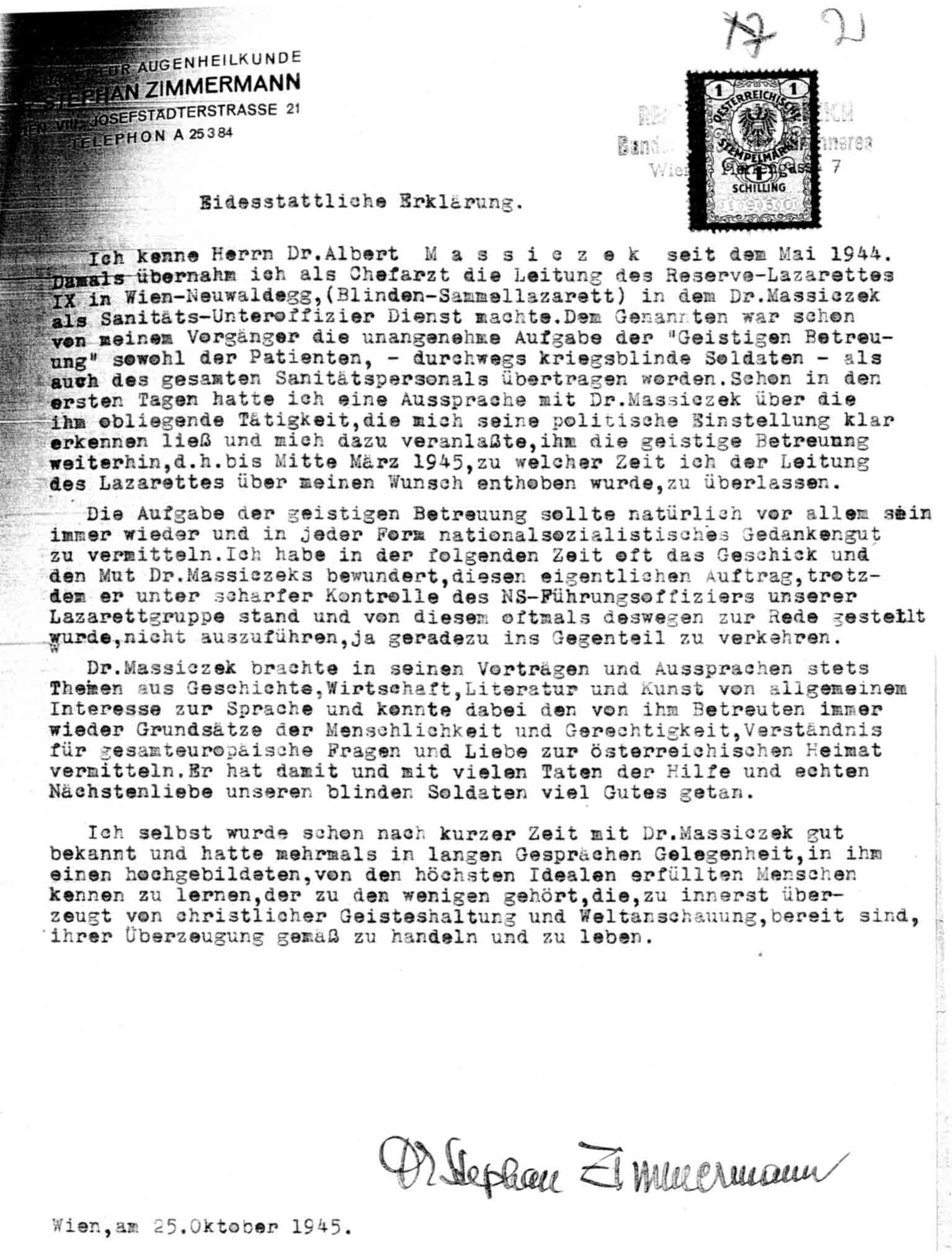 Ich kenne Herrn Dr. Albert Massiczek seit dem Mai 1944. Damals übernahm ich als Chefarzt die Leitung des Reserve-Lazarettes IX in Wien-Neuwaldegg, (Blinden-Sammellazarett) in dem Dr. Massiczek als Sanitäts-Unteroffizier Dienst machte. Dem Genannten war schon von meinem Vorgänger die unangenehme Aufgabe der „Geistigen Betreuung“ sowohl der Patienten, – durchwegs kriegsblinde Soldaten – als auch des gesamten Sanitätspersonals übertragen worden. Schon in den ersten Tagen hatte ich eine Aussprache mit Dr. Massiczek über die ihm obliegende Tätigkeit, die mich seine politische Einstellung klar erkennen ließ und mich dazu veranlaßte, ihm die geistige Betreuung weiterhin, d. h. bis Mitte März 1945, zu welcher Zeit ich der Leitung des Lazarettes über meinen Wunsch enthoben wurde, zu überlassen.