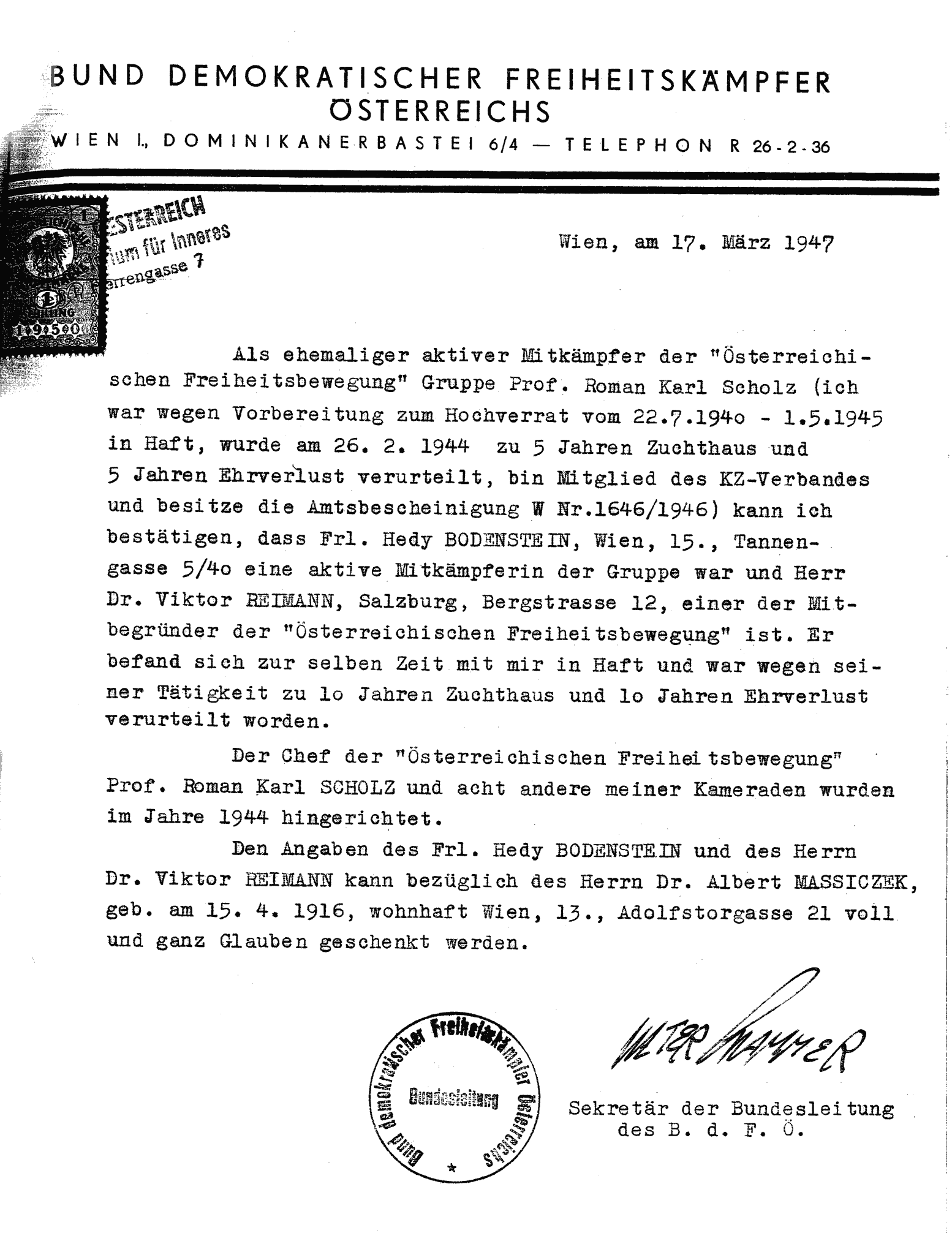 Als ehemaliger aktiver Mitkämpfer der „Österreichischen Freiheitsbewegung“ Gruppe Prof. Roman Karl Scholz (ich war wegen Vorbereitung zum Hochverrat vom 22. 7. 1940 – 1. 5. 1945 in Haft, wurde am 26. 2. 1944 zu 5 Jahren Zuchthaus und 5 Jahren Ehrverlust verurteilt, bin Mitglied des KZ-Verbandes und besitze die Amtsbescheinigung W Nr. 1646/1946) kann ich bestätigen, dass Frl. Hedy BODENSTEIN, Wien, 15., Tannengasse 5/40 eine aktive Mitkämpferin der Gruppe war und Herr Dr. Viktor REIMANN, Salzburg, Bergstrasse 12, einer der Mitbegründer der „Österreichischen Freiheitsbewegung“ ist. Er befand sich zur selben Zeit mit mir in Haft und war wegen seiner Tätigkeit zu 10 Jahren Zuchthaus und 10 Jahren Ehrverlust verurteilt worden.