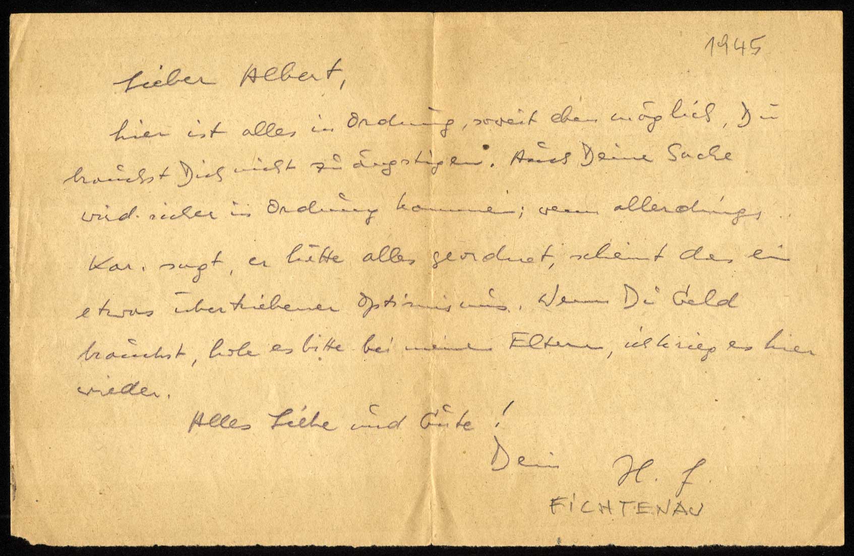hier ist alles in Ordnung, soweit eben möglich. Du brauchst Dich nicht zu ängstigen. Auch Deine Sache wird sicher in Ordnung kommen; wenn allerdings Kar. [Karasek] sagt, er hätte alles geordnet, scheint das ein etwas übertriebener Optimismus. Wenn Du Geld brauchst, hole es bitte bei meinen Eltern, ich krieg es hier wieder.